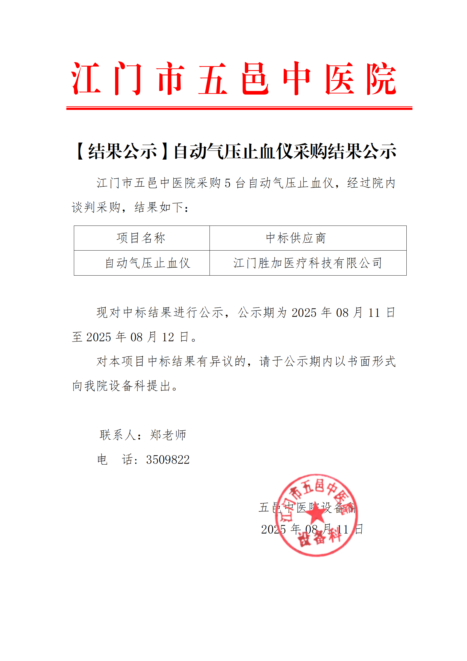 医疗设备采购结果公示-自动气压止血仪