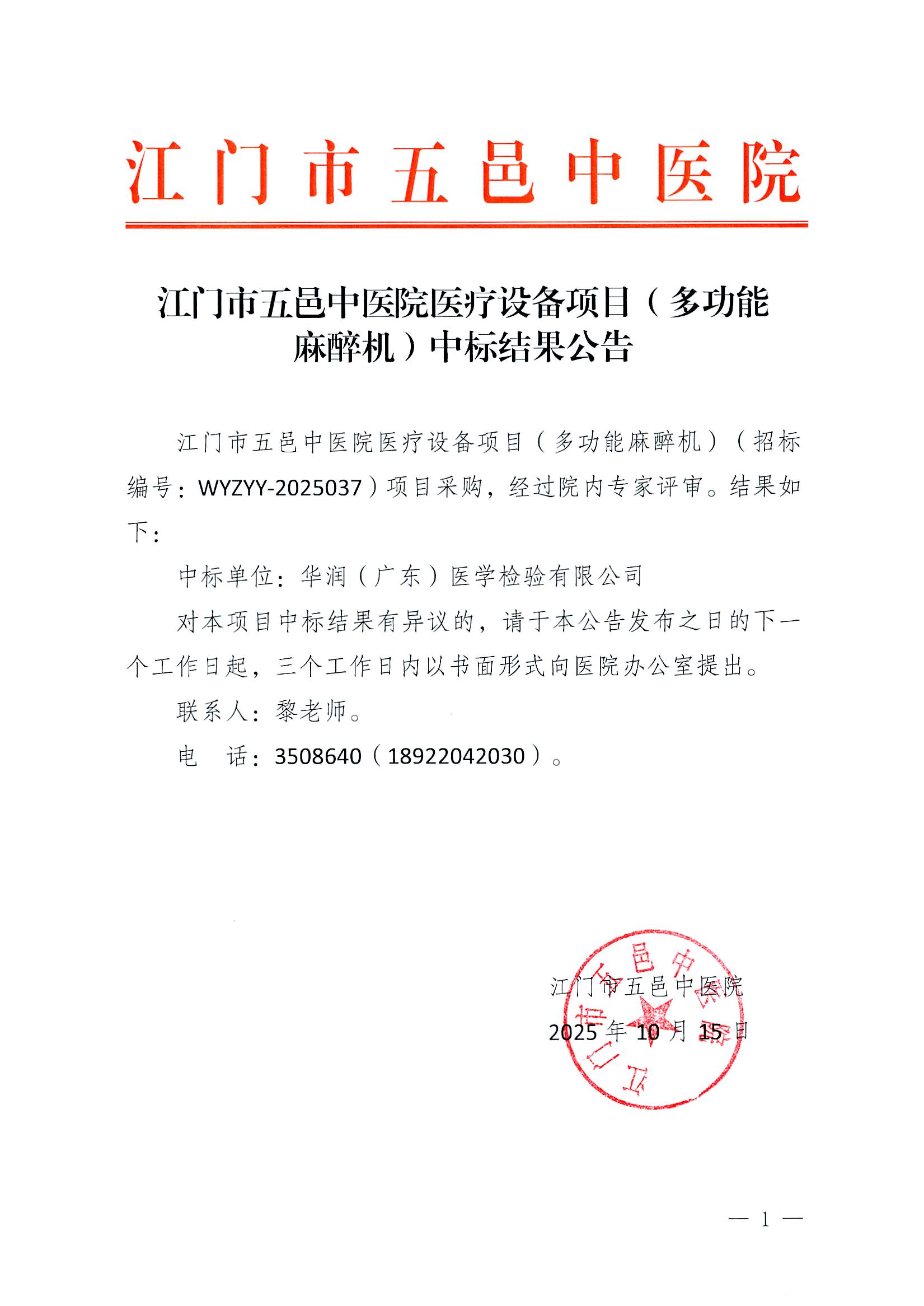 江门市五邑中医院医疗设备项目(多功能麻醉机)中标结果公告